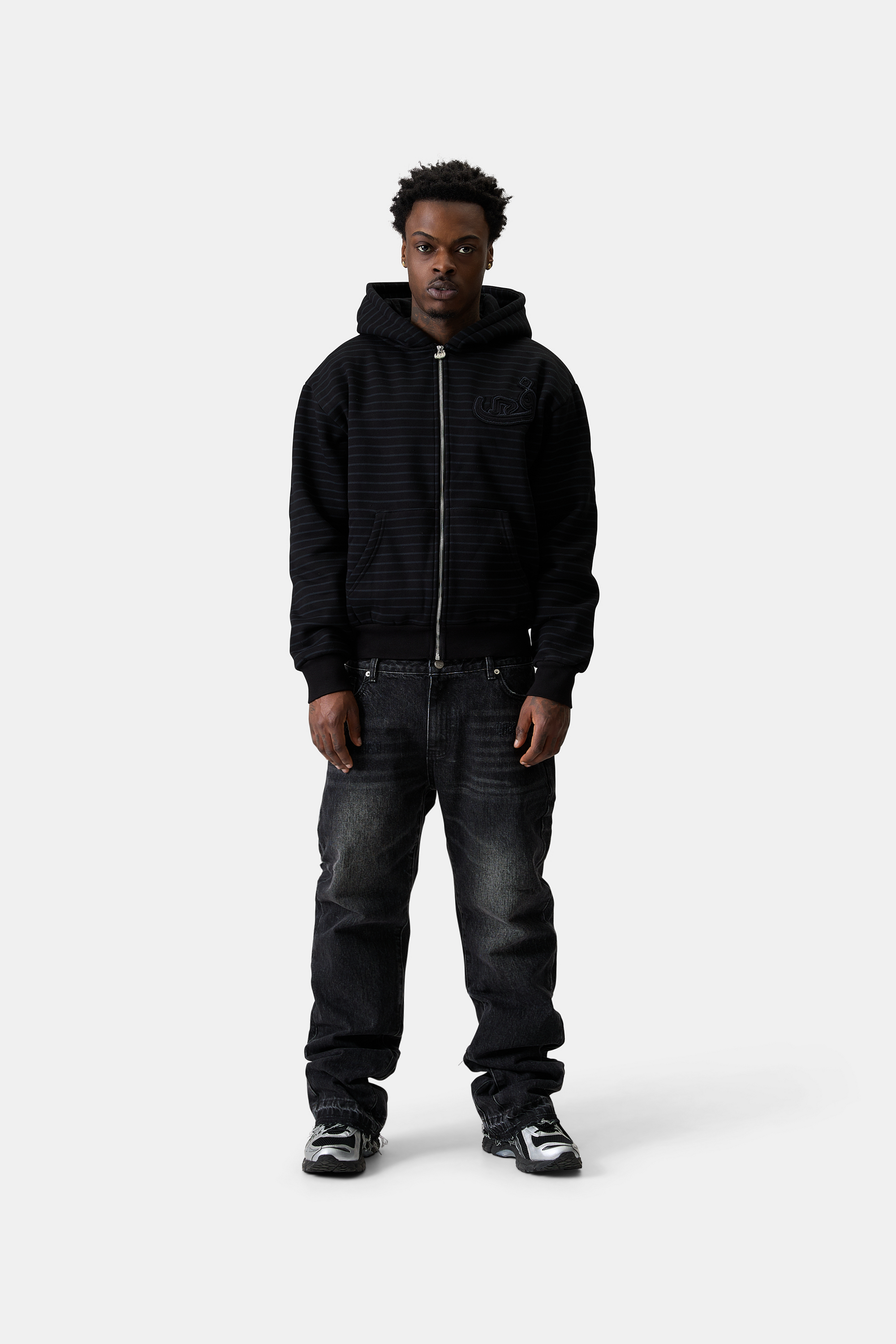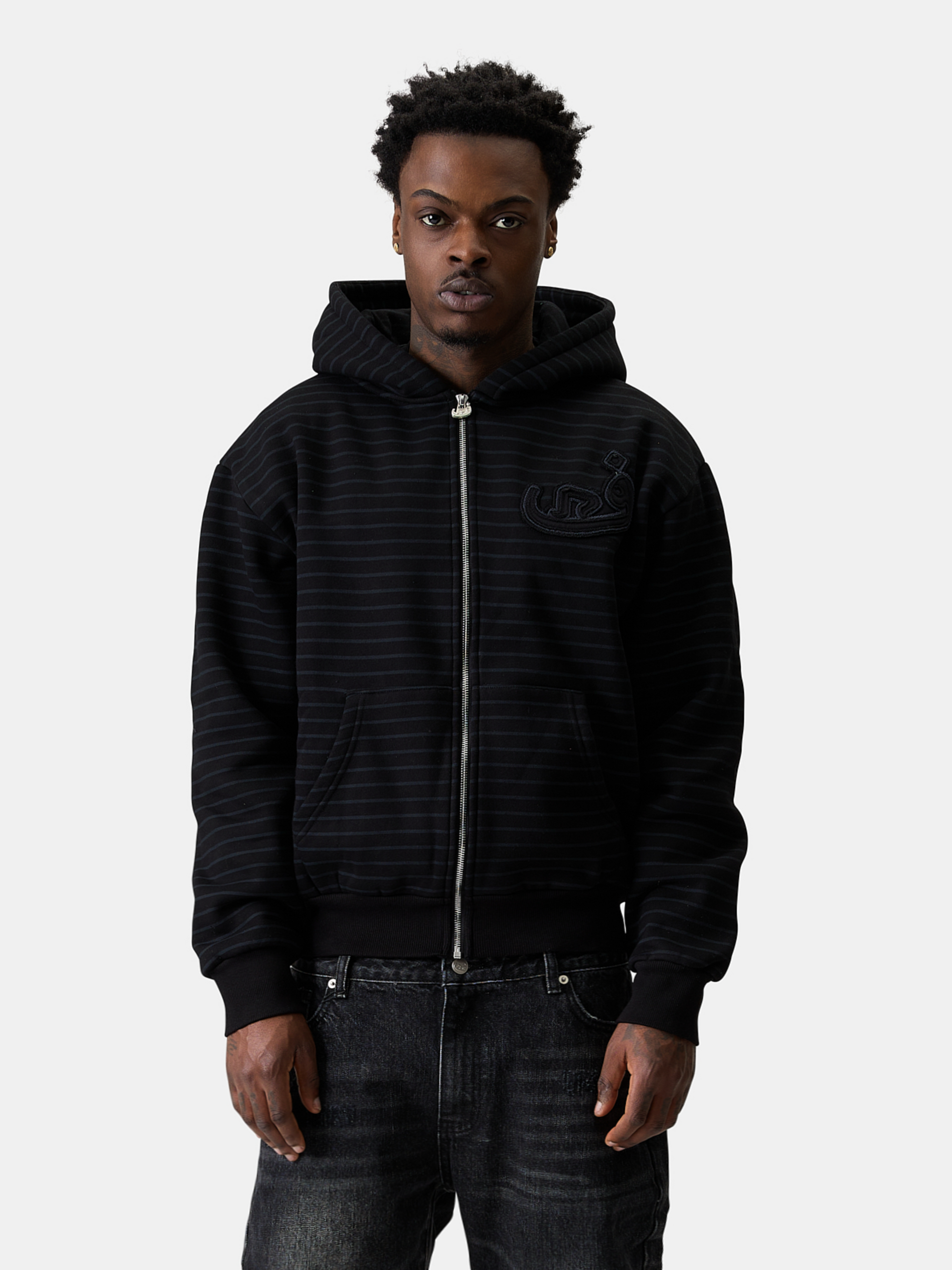 Zip Hoodie Stripe Frayed - Black